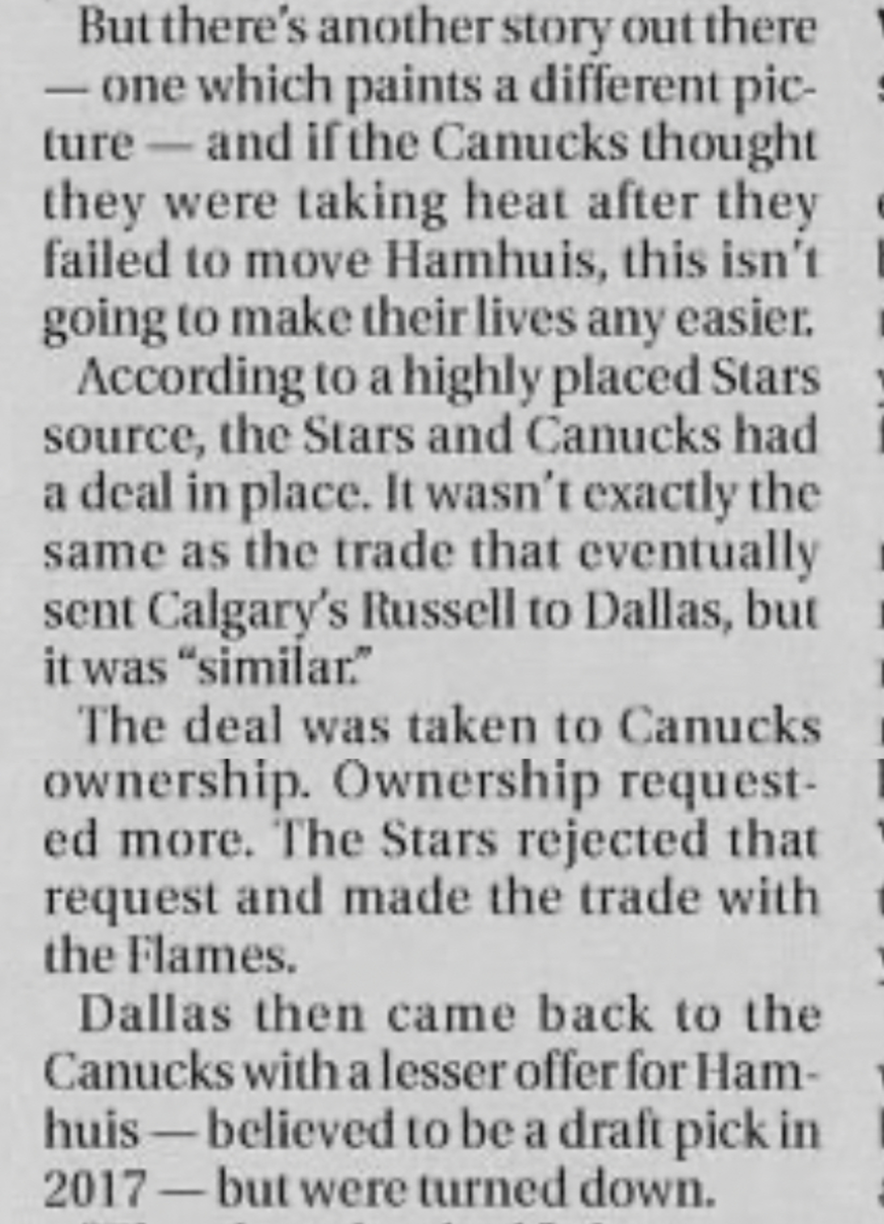 Whether Benning and Co. already knew that they weren’t bringing Hamhuis back at the trade deadline and failed to get anything at all for him in trade remains one of those great Canuck questions.