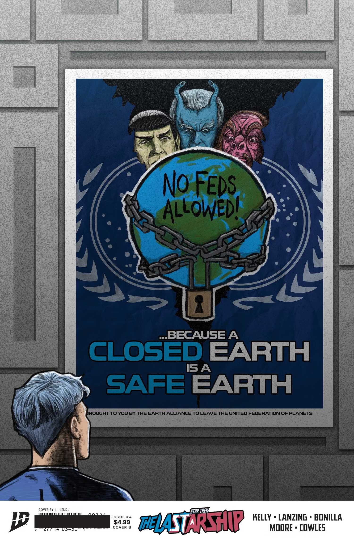 A variant cover shows an onlooker staring at a blatant, anti-Federation propaganda poster that touts the merits of a “closed Earth.”