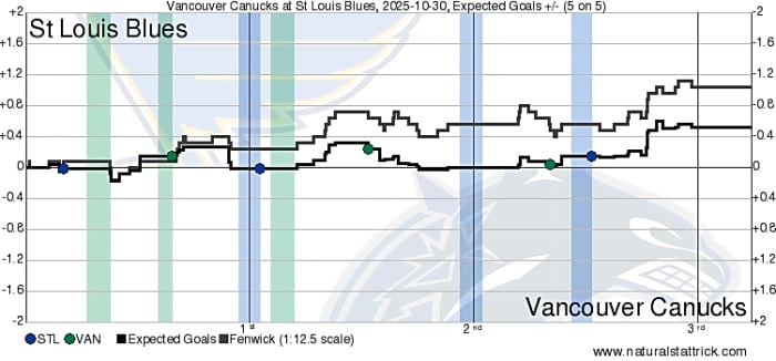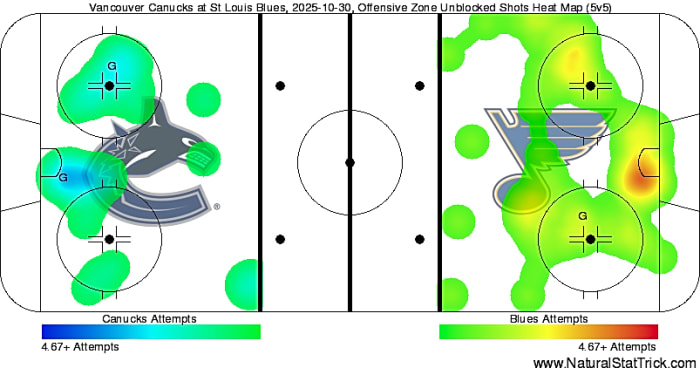 The heat map isn’t anything tremendously impressive from either team. Overall, there weren’t a lot of scoring chances to speak of at 5v5 play, with the Blues holding a narrow 20-18 edge on that front. In terms of high-danger chances, St. Louis owned a 10-7 lead. But as shown on the heat map, that difference didn’t really add a whole lot to their hot spot in relation to the Canucks. A low-key game isn’t the worst thing in the entire world, given the kind of personnel that Vancouver has been forced to call up and ice.